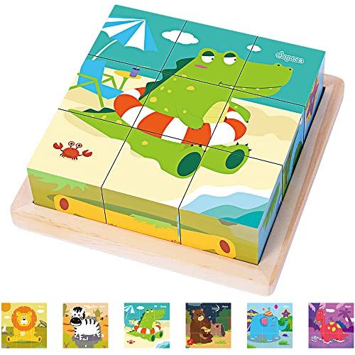 Japace Kubpussel, 3D-bildkuber, pusselspel 6-i-1, djurmotiv, träpussel för barn från 1 2 3 4 år, Montessori, pedagogisk leksak, gåva för pojkar och flickor
