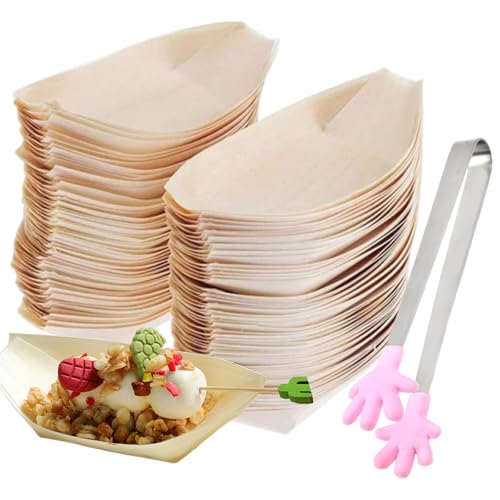 LURNODY Set med 200 tallträskålar + silikonklämma, nedbrytbar träskål, engångsmat, engångsbåtform, lämplig för servering av snacks pommes frites sallad sushi tårta