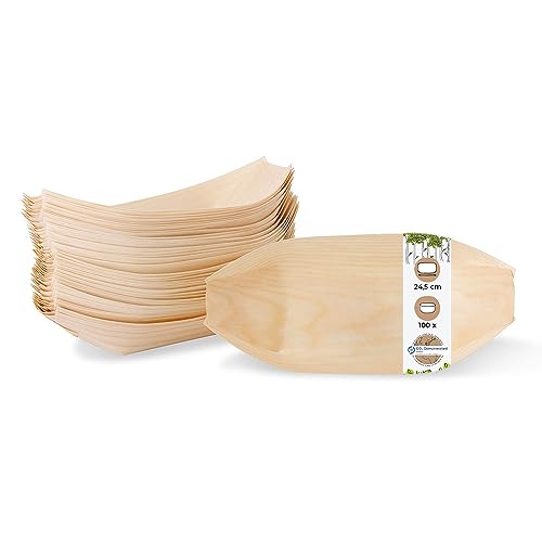 GREENBOX träskål, fartyg av furu I ekologisk engångsporslin hållbar och komposterbar I snackskål för Fingerfood Currykorst pommes sushi I serveringsskål kall och varm mat 100 st