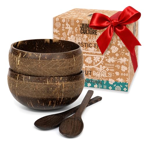 JUNGLE CULTURE 2 polerade kokosnötskålar och träskedar Set - Naturliga kokosnötskålar & bambussnören - SmoothieBowls - Coconut Shell Acai Healthy Choice Buddha
