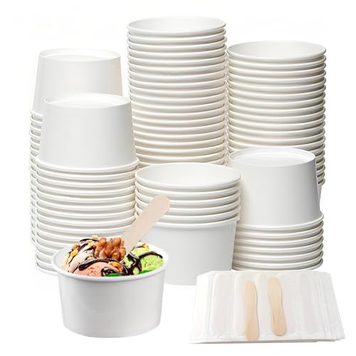 LoNinLoan Papper glasskoppar 60 st 85 ml engångs vita papper efterrättsbehållare med träskedar, perfekt för Sundae, fryst yoghurt, pudding, gelé