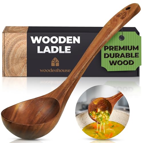 WOODENHOUSE LIFELONG QUALITY Träslev för matlagning, soppsked slev - teakträ serveringssked, 12,4 tum handtag, medium skopa storlek 56,7 g - miljövänlig, naturlig och hållbar