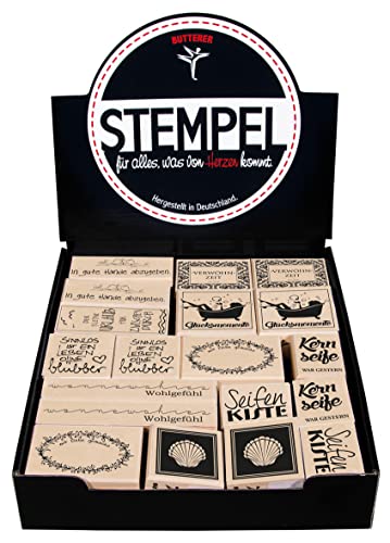 Rayher Display stämpel wellness/lyckostunder 10 stämpelmotiv med temat må-bra-känsla, 9 x per motiv 2 stämplar, 1 motiv 1 stämplar, totalt 19 stämplar, trästämplar, olika storlekar, 29065000