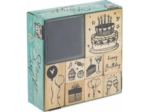 folia 31104 – trästämpelset Happy Birthday, inklusive 9 trästämplar och 2 stämpelkuddar – perfekt för att dekorera kort, vänskapsböcker, bokstäver och scrapbooking