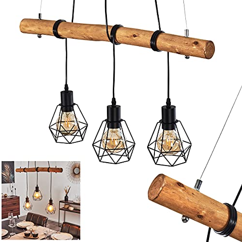 Pendellampa Pila, hängande lampa av metall/trä i svart/natur i vintage-design, pendel i öppen design med trästång och skärmar i galleroptik, 3-lampa, 3 x E27, utan glödlampor
