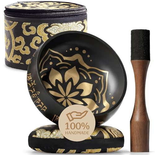 Tibetanskt klangskålset, lätt att spela med ny trästav med dubbla ändar och kudde, skapar vackert ljud för holistisk helande, stresslindring, meditation och avkoppling, lyckomönster, svart skål med svart kudde