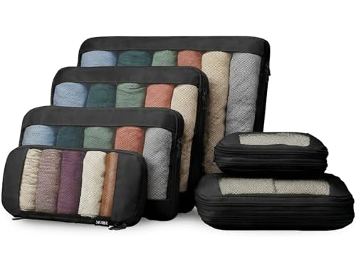 MURISE Compression Packing Cubes Set om 6, Komprimerbar Packkuber för Ryggsäck, Suitcase Organizer Resekuber för Semester och Resor, Travel Essentials, Svart