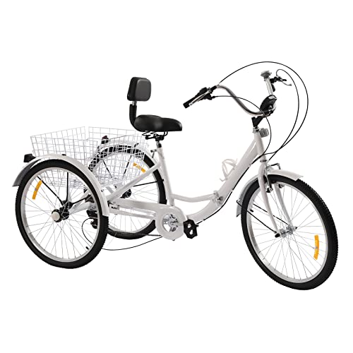 HuKaiL 24 tum vikbar trehjuling för vuxna, 7-växlad trehjuling med korg, höjdjusterbar trehjulig för vuxna och äldre för fritidsplanering, vit