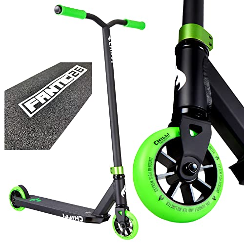 Chilli Pro Scooter stunt-Scooter H = 82 cm Trick Pedal Roller svart grön Fantic26 klistermärke grepptejp