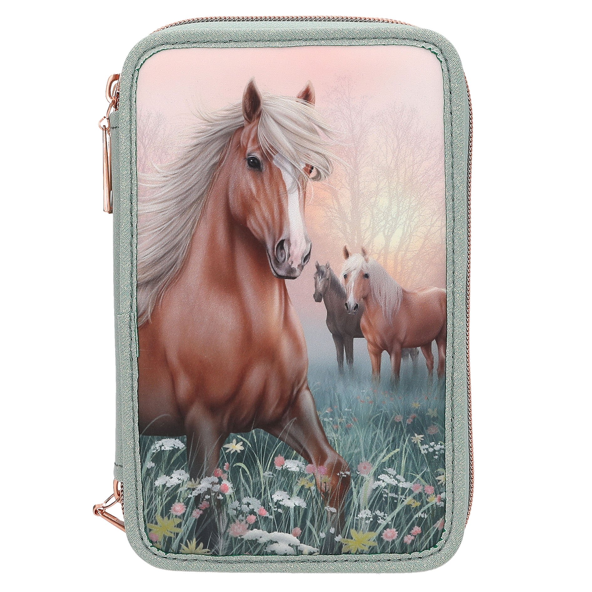 Miss Melody - Trippelpennfodral Med Hästhuvud Applikation - Ljusturkos - Sage Green