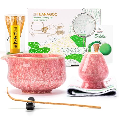 TEANAGOO Matcha Whisk Set, 7pcs matcha set pink, ceremony matcha kit, matcha tea set for making latte, ceramic bowl (chawan) white spout and whisk, gift for matcha lovers