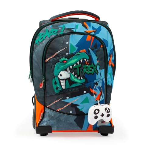 GIOCHI PREZIOSI Go Pop-Trolley ryggsäck 2R T-Rex, fram- och innerficka, vadderat ryggstöd och axelremmar, tyg och teleskopiskt handtag, vagn med förstärkta hjul pop up-formade hjulskydd, Flerfärgad,