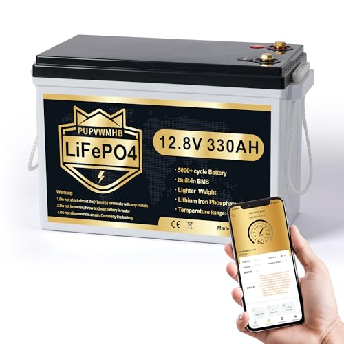 PUPVWMHB 12 V 330 Ah Bluetooth LiFePO4 batteri, 200 A BMS 12 V Bluetooth-litiumbatteri, upp till 15 000 cykler, max 4 224 Wh energi med låg temp cut off, perfekt för husbil, sol, trolling motor