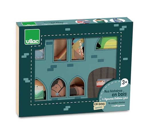 VILAC - Mina träberättelser starkt slott - 6 träfigurer: Riddare, drake, prinsessa, katapult, häst och trollkarl - uppvaknande spel för barn - från 3 år - 3501