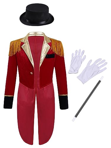 Msemis Barn pojkar cirkus kostym set långärmad frack jacka med hatt trollstav handskar för halloween kostym karneval temafest röd A 158–164