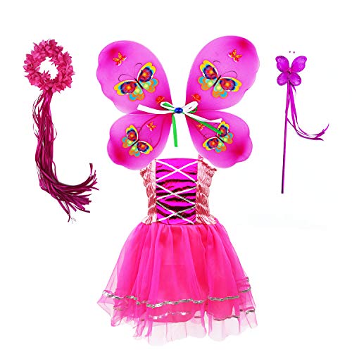 Tante Tina Fjäril älvadräkt flicka – 4-delad flickkostym med tyllklänning, vingar, trollstav och hårband – fuchsia – lämplig för barn från 2 till 8 år