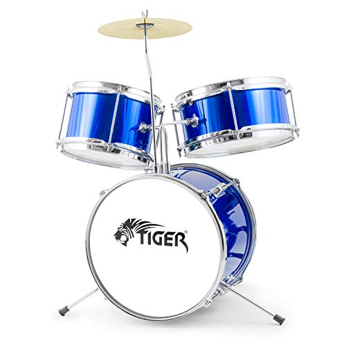 TIGER Junior barn trumma kit, 3-delad nybörjare barn trumma set med virke, tom, bastrumma, pedal, cymbal och pinnar – blå
