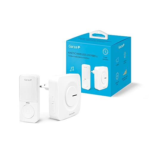 Garza - Kinetic trådlös dörrklocka för dörr, 1 tryckknapp + 1 mottagare, Kraftfull räckvidd 200 m, 64 melodier, IP56, med LED-indikator, tyst läge, 4 ljudintensiteter, Minnets funktion, Vit