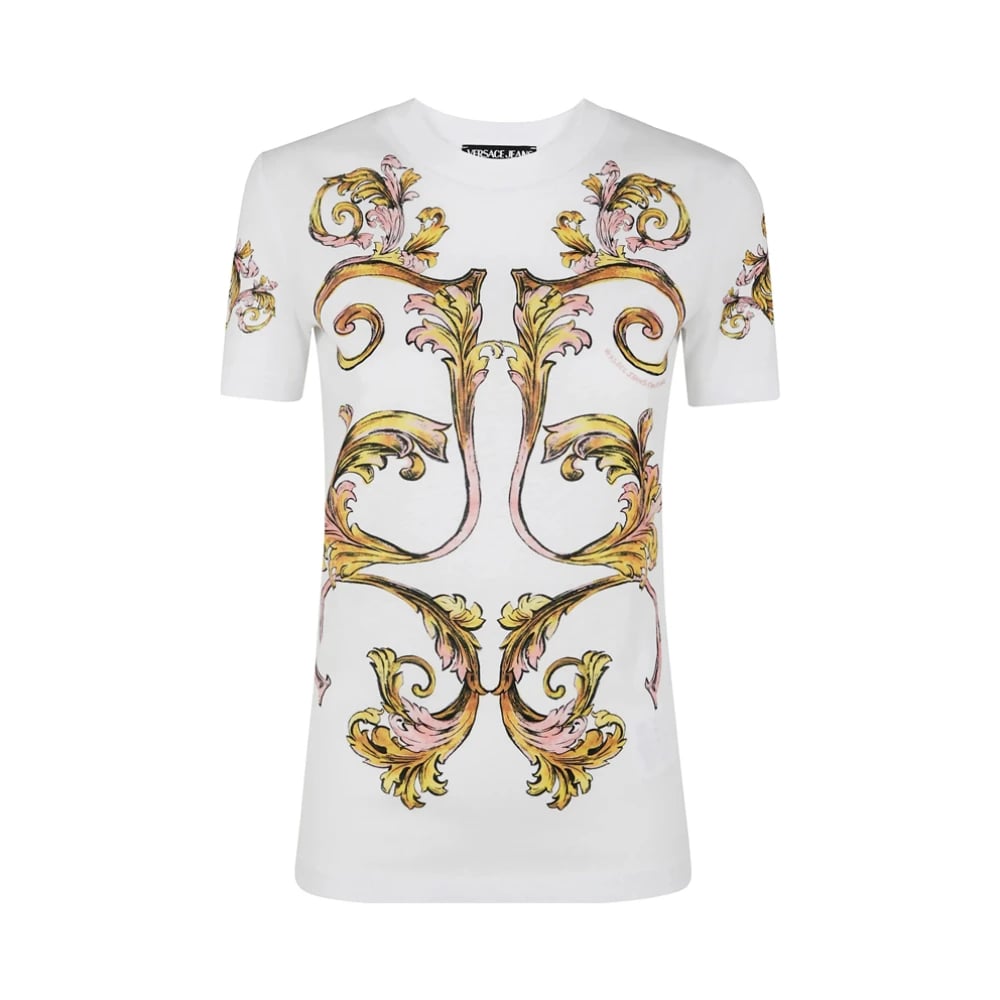 Versace Jeans Couture, Toppar , Dam, M, Bomull, Barocktryckt vit T-shirt Slim Fit