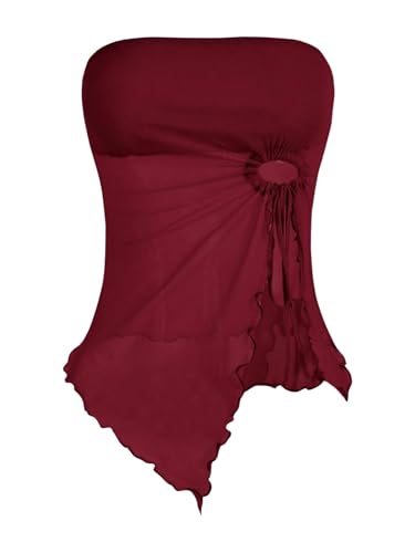GORGLITTER Tubtopp, crop top av mesh för damer, axelbandslös topp, Y2k-topp med vågfåll, axellös, sommartopp med slits, Bordeaux, XS