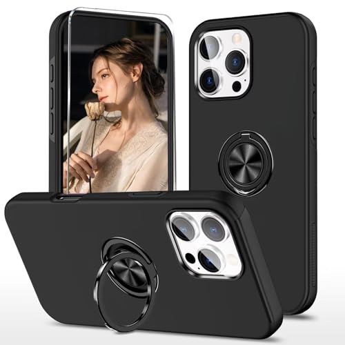 HAONANDE mobiltelefonfodral För iphone 16 Pro Max,Stötskydd Mobilskal Med 360° Ring Ständer,1* Härdat Glas,Stötsäker Tuff Rustning Hård Pc militärt Skydd Stativ Case,Svart