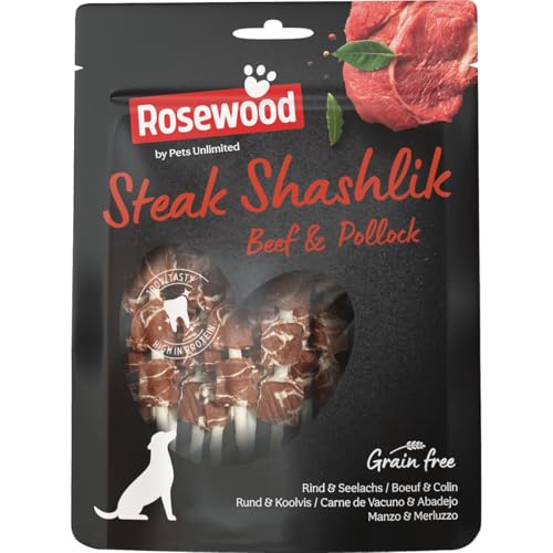 Rosewood Steak Shashlik hundmellanmål – spannmålsfria tuggpinnar med nötkött & sej, högkvalitativt proteinmellanmål för hundar – tandvårds-tuggsnack, 100 g