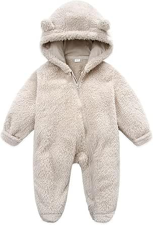 Älva baby snödräkt, nyfödd baby med huva fotad sparkdräkt fleece snödräkt tecknad flanell dragkedja jumpsuit tunn höst vinterkläder, BEIgE, 3-6 Months
