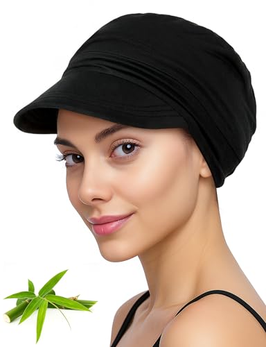 Becellen Mössa sommar damer, bambutyg mjuk solhatt kemo-huvudbonad andningsaktiv beanie med veck svart tunn mössa chemo turban med elastisk för kvinnor kvinnor
