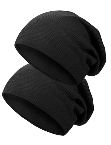 Kiiwah 2 stycken tunn beanie-mössa för män och kvinnor, unisex, slouch-mössa, elastiska stickade mössor, lång beanie, mjuk mössa hattar, svart, En Storlek