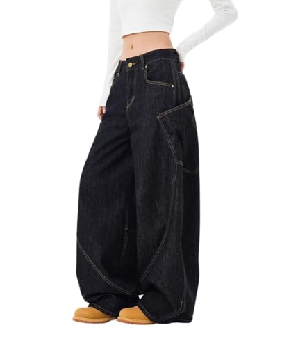 Lafaguw Baggy jeans för kvinnor män hög midja tunna ben jeans vardagliga lösa denimbyxor streetwear kläder, Svart1, XS