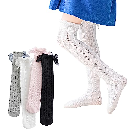 Jupsk 4 par flickknästrumpor skolstrumpor med rosett spets bomullsstrumpor färgglada långa vita strumpor tunna nätstrumpor sommar för småbarn barn 4–10 år, flerfärgad, 4-10 Jahre