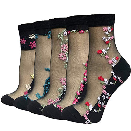 DXYAKY 5 par kvinnor genomskinliga tunna nätstrumpor genomskinliga tunna spetsar andningsbara strumpor blommönstrade silkesstrumpor, Svart - Blomma, One Size