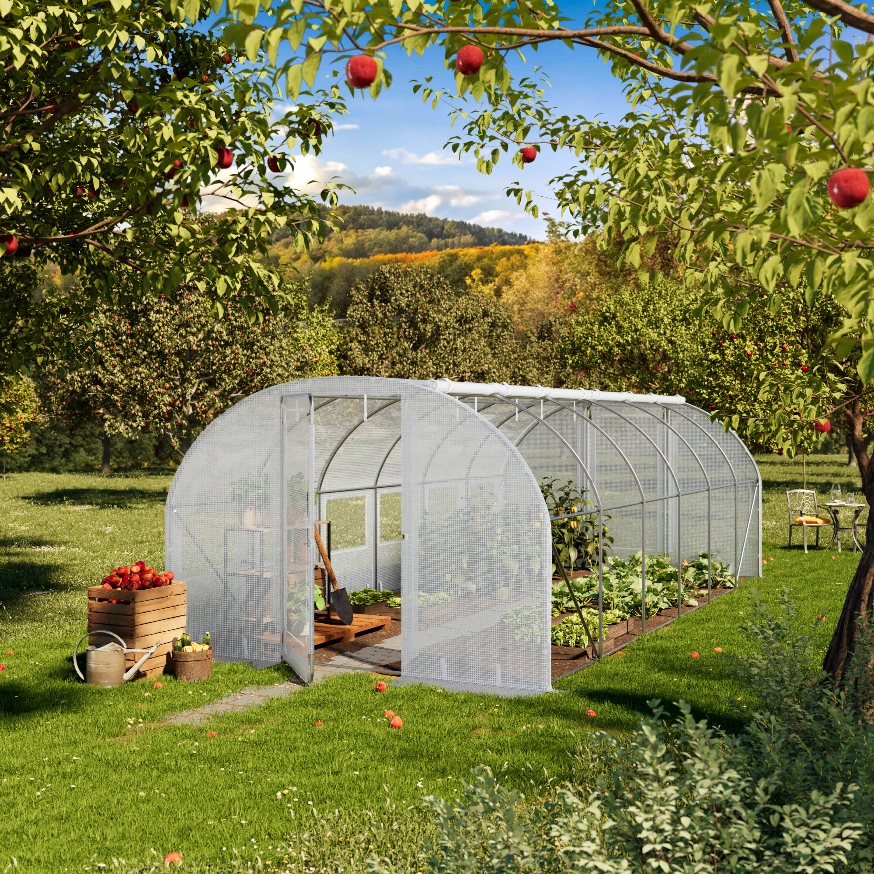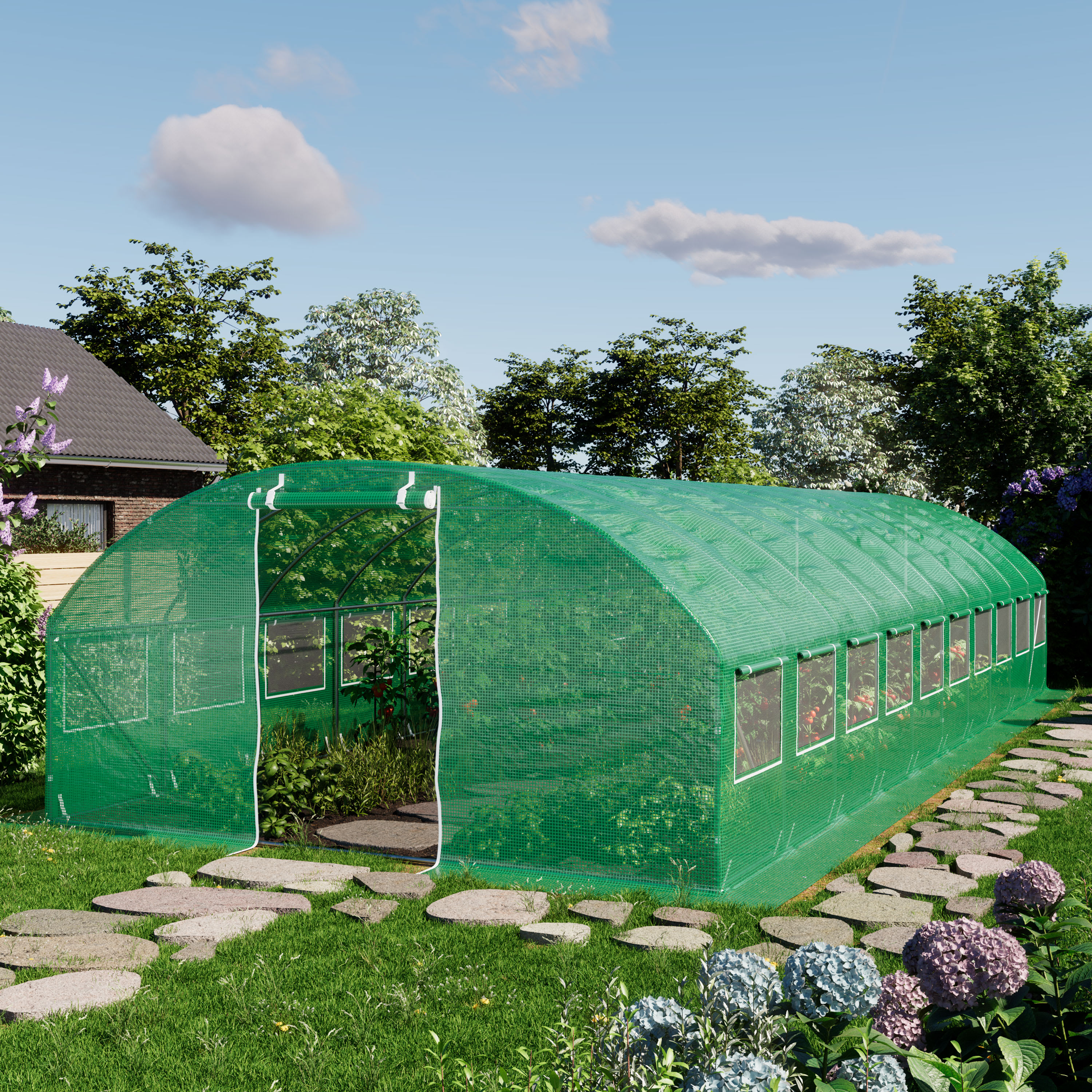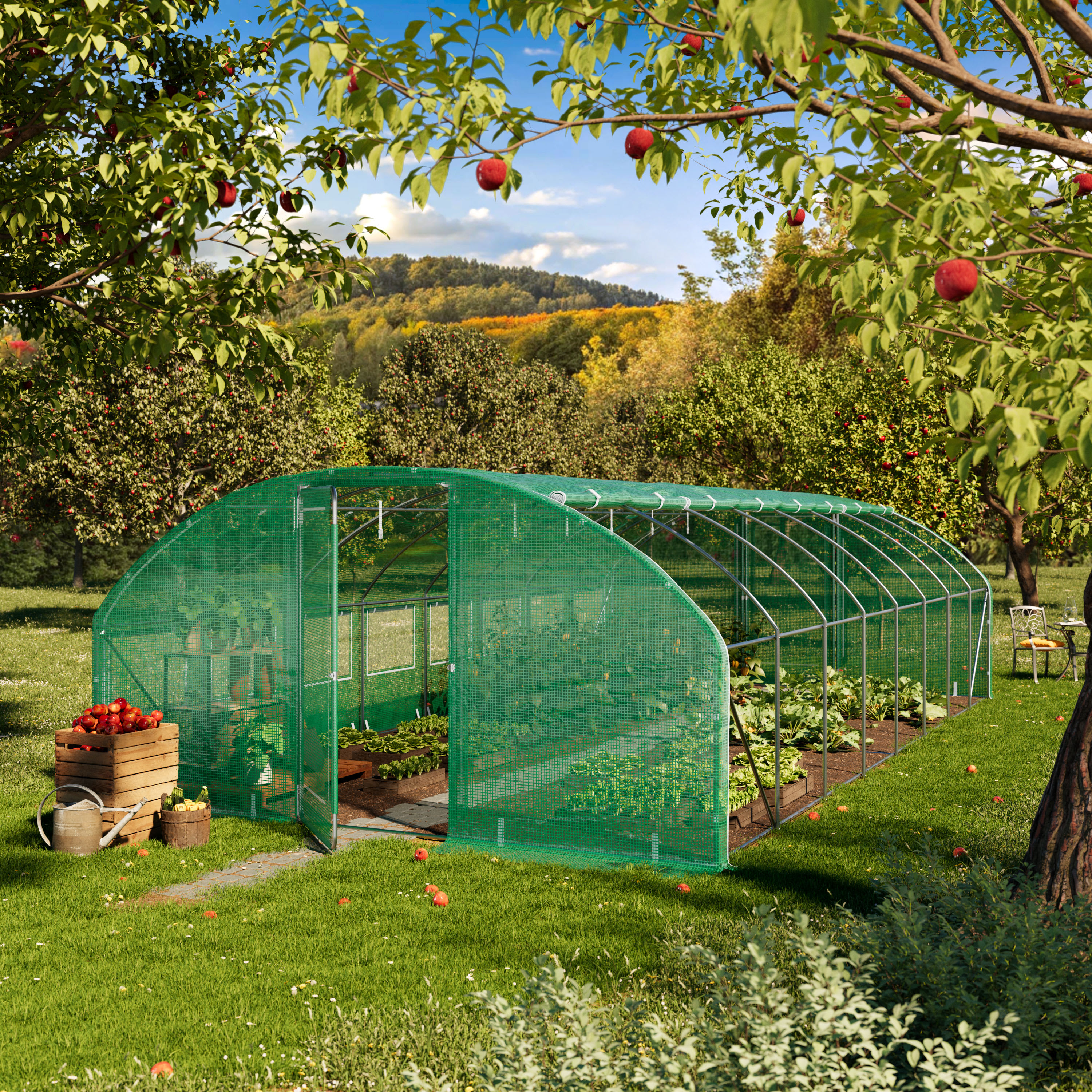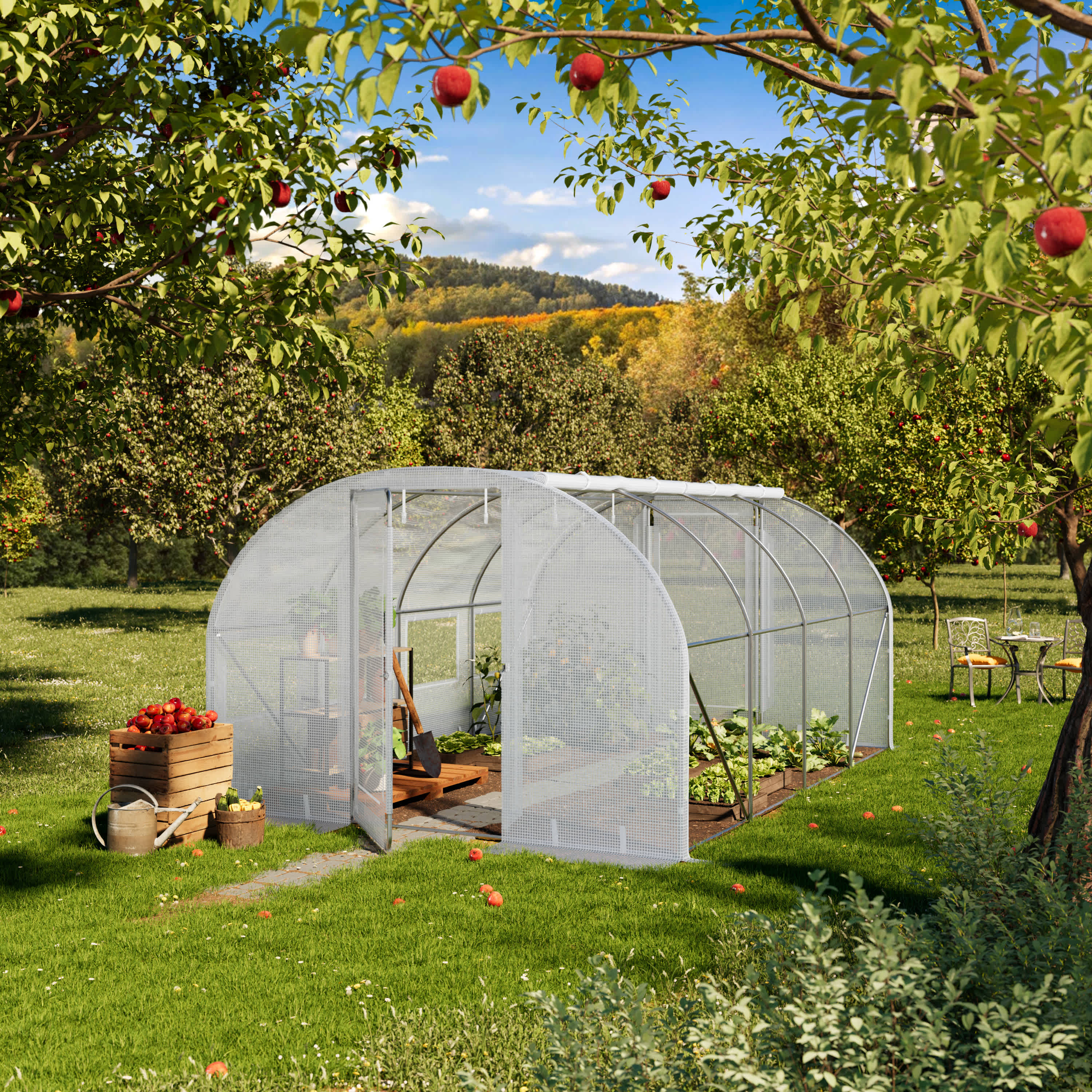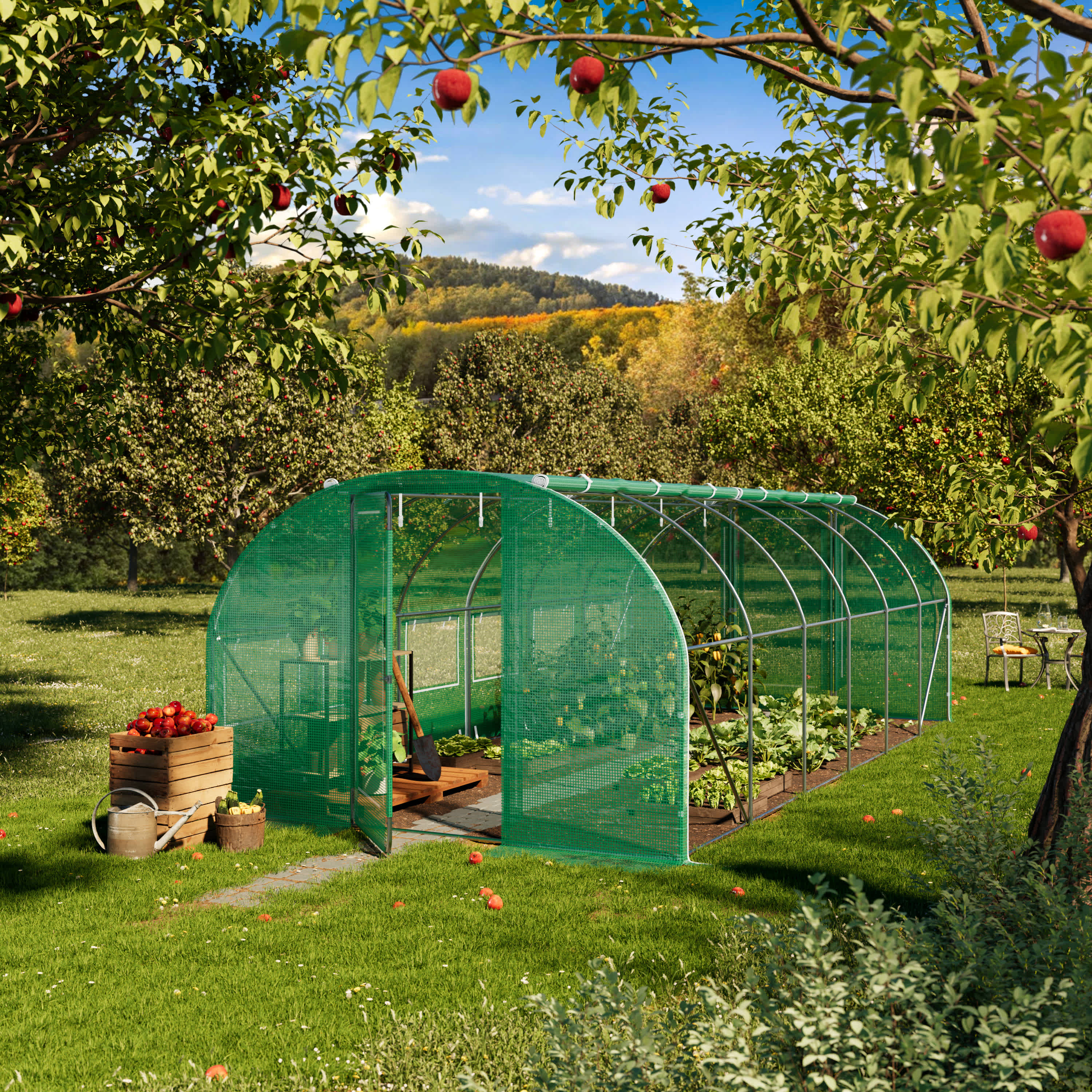 Utomhusväxthus - Tunnelväxthus - 397x300x200 cm - UV-skyddad PE - 6 nätfönster - 3 rullportar med dragkedja - Vattentätt - Grön