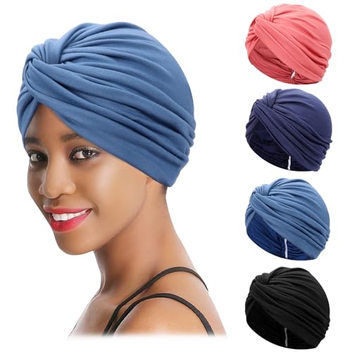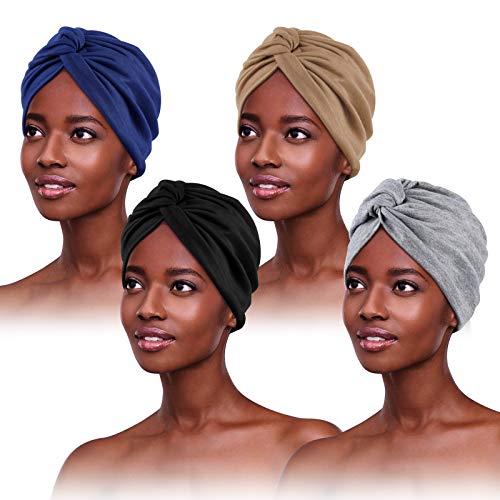 XEPST 4 stycken Kemoterapi Turban för kvinnor, Afrikansk elastisk förknuten huvudbonad, nattmössa för håravfall, Svart, blå, marinblå, rosa, one size