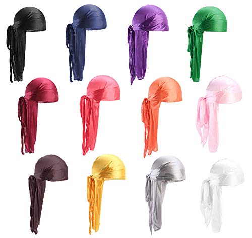 12-pack durag med lång bakdel, unisex durag, huvudbonader med breda remmar, pirat, håravfall, turban, hatt för kvinnor och män, hiphop och daglig dekoration, flera färger