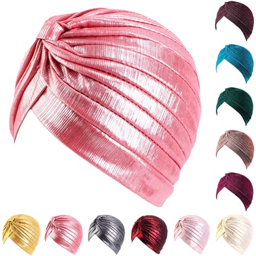 HINGTAT Guld glänsande polyester herr och dam Mellanöstern turban hatt, metallisk etnisk vintage turban hatt, Baotou bottenmössa, Mellanösternstil, veckad design, unisex, Metallisk-vattenmelonröd, one