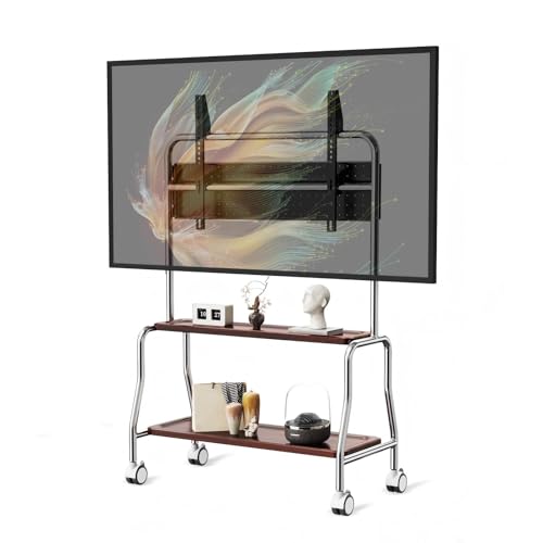 TV-bänk med hjul, staffli, rullande TV-stativ för 32–75 tums LCD, LED, OLED, platt skärm, stativ i rostfritt stål, max 50 kg, VESA 600 x 400 mm (dubbla förvaringshyllor i trä, med hålplattform)