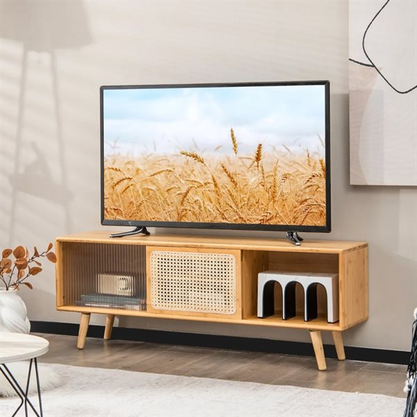 COSTWAY TV-skåp bambu, TV-bänk med rotting- och glasskjutdörr, TV-bord med justerbart hyllplan, TV-skåp för TV-apparater upp till 55 tum, 120,5 x 31 x 45,5 cm (natur)