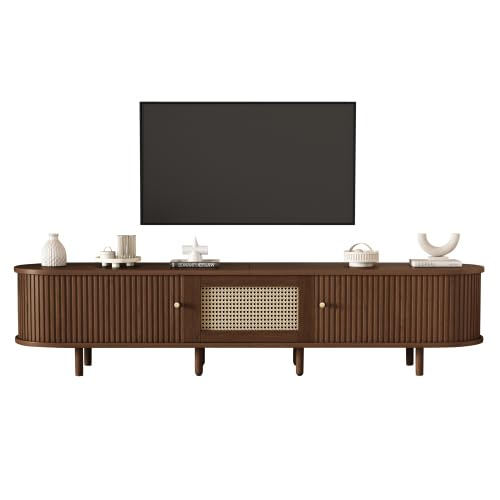 HAINEW Modernt TV-skåp, TV-bänk med 1 rottinglåda och 2 skjutdörrar, oval TV-bord, TV-skåp med träben för vardagsrum, sovrum, 180 × 40 cm, valnöt