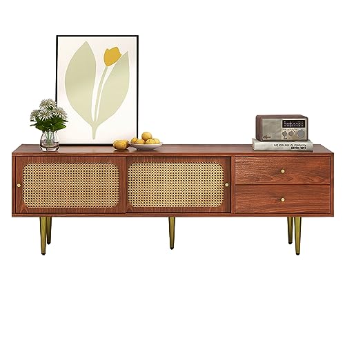 Modern stil TV-bänk med 2 plastrottingskjutdörrar och 2 lådor, snyggt TV-stativ med rörligt laminat, TV-bord, TV-hylla för vardagsrum, för TV upp till 70 tum (valnöt), HNDE307067068