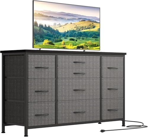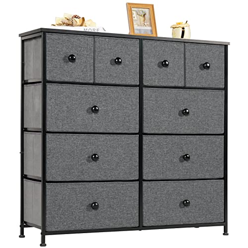 Zstar Byrå för sovrum med lådor, metallram TV-skåp i tyg med 3 uttag, modern dekoration träbordsskiva byrå med 10 lådor för sovrum, vardagsrum, grå