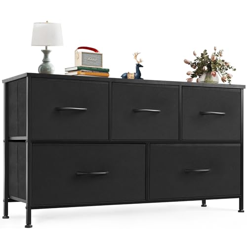 NEWBULIG Skåpförvaring och förvaring, TV-stativ för sovrumsmöbler med hyllor, lättdragna tygbehållare, metall trä, svart, 5 lådor