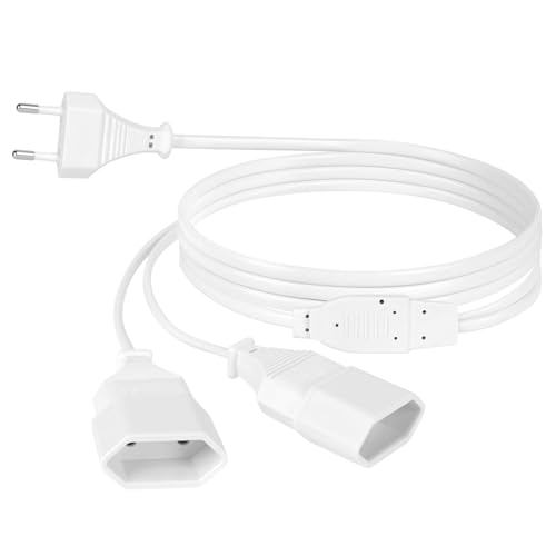 AXFEE-förlängningskabel 250 V/2,5 A, 2 m hane till hona förlängningskabel, 1 till 2 europeiska kontakter, för TV, dator, bildskärm, beamer, hushållsapparater, vit