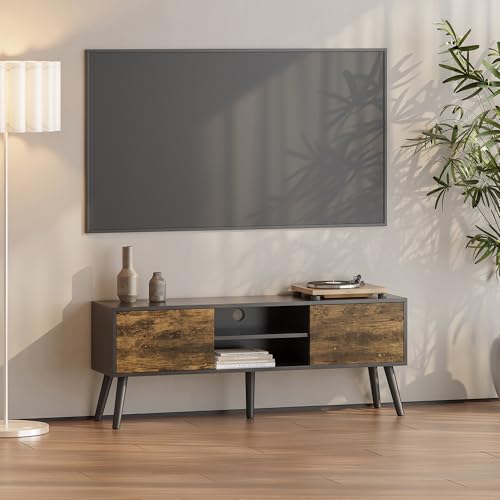 Tv-bänk Tv-skåp Mediaförvaring Sidobord Sideboard med 2 Dörrar Öppna Hyllor 5 Ben i Trä Max.20 kg Melaminbelagd Spånskiva Kabelgenomföring Mörk Träfärg Svart 120x29,5x46,5cm
