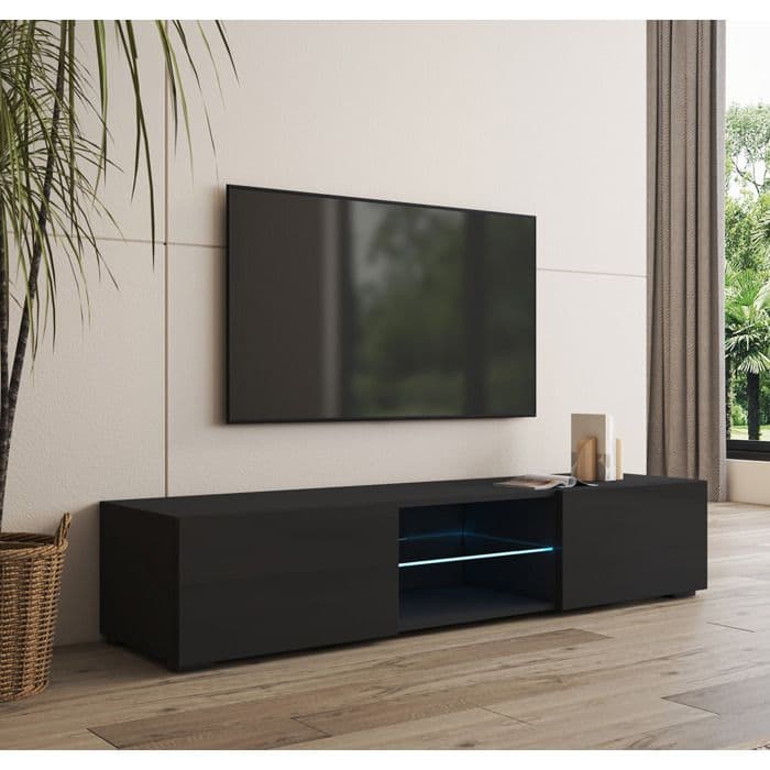 TV-möbel med ben för vardagsrum | Blå LED | Färg Svart | 2 Dörrar 1 Vitrin | 160 x 32 x 38,5 cm | Modell Tibi