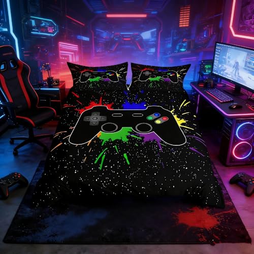 Game påslakan pojkar TV-spel sängkläder set dubbel för barn tonåringar barn sovrum dekor modern spelare spelkontroll täcke skydd mjuka ungdomar spel färgglada batikfärgade sängöverkast skydd
