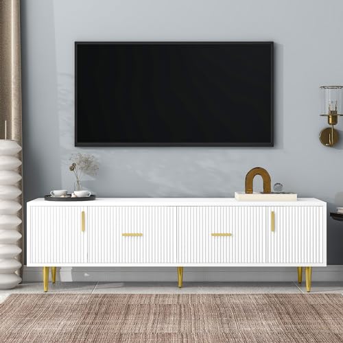 HAINEW Modernt TV-skåp, vitt, TV-bänk med 2 dörrar och 2 lådor, 170 cm långt TV-stativ, TV-skåp, TV-bord, TV-bord med gyllene handtag och vertikala ränder för vardagsrum