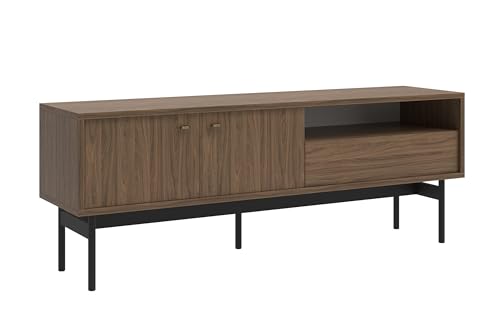 Modern stil TV-bänk med 2 plastrottingskjutdörrar och 2 lådor, snyggt TV-stativ med rörligt laminat, TV-bord, TV-hylla för vardagsrum, för TV upp till 70 tum (valnöt), HNDE307067068