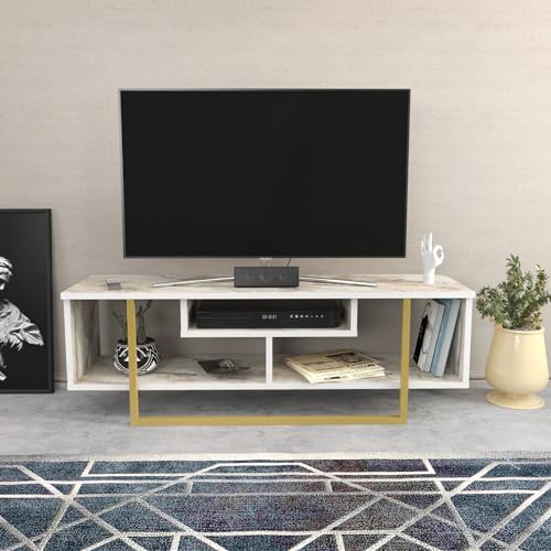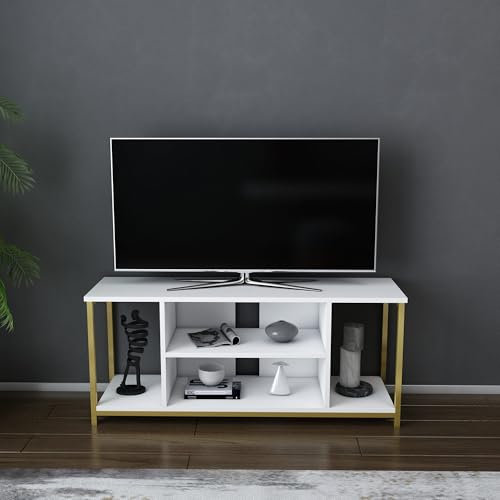 Hanah Hem elegant TV-stativ, vitt och guld, 160 cm x 35 cm x 50,8 cm | 100% melaminbelagd partikelbräda, 18 mm tjock | Snygg förvaring för moderna vardagsrum