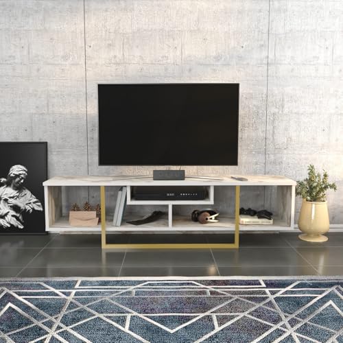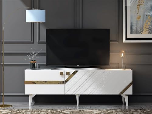 Hanah Hem elegant TV-stativ, vitt och guld, 150 cm | 100% melaminbelagd partikelbräda, 18 mm tjock | Snygg design för moderna vardagsrum och underhållningsplatser
